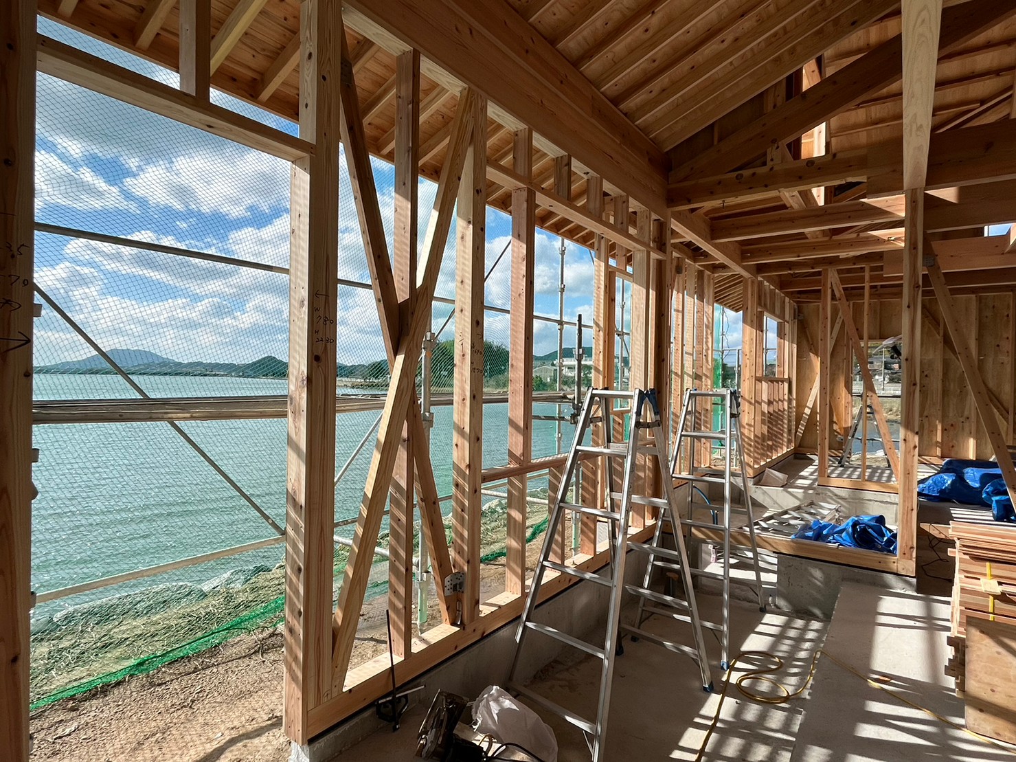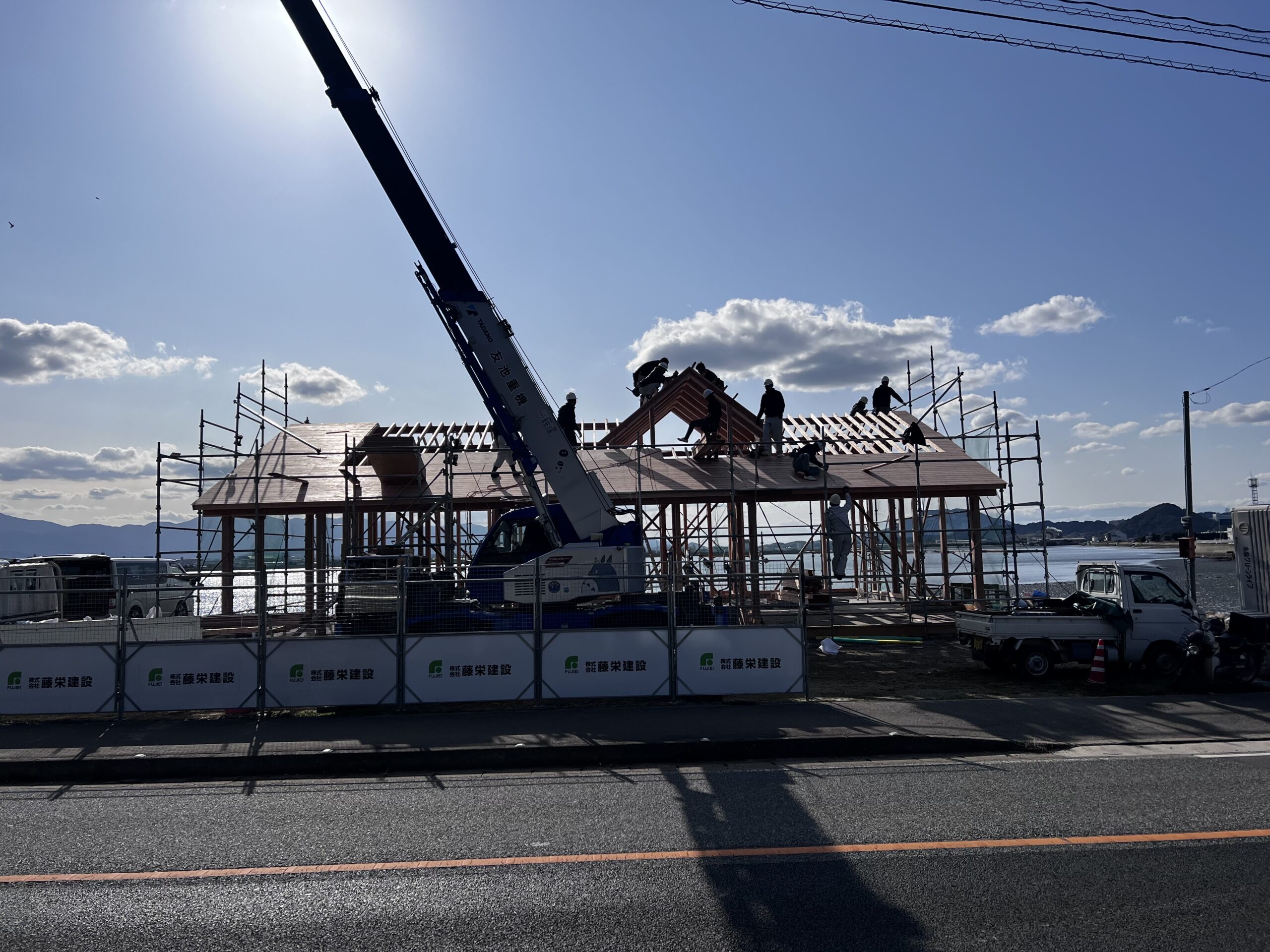 TimelessCafe 棟上げの様子。天気も良くいい感じ 今津干潟に出っ張っている土地なので3方向海の状態です。波も穏やかで癒されます 建物は完成しお施主様に引渡されました。内部はこれからお施主様が手を加えられていきます。カフェのOPEN楽しみです!!